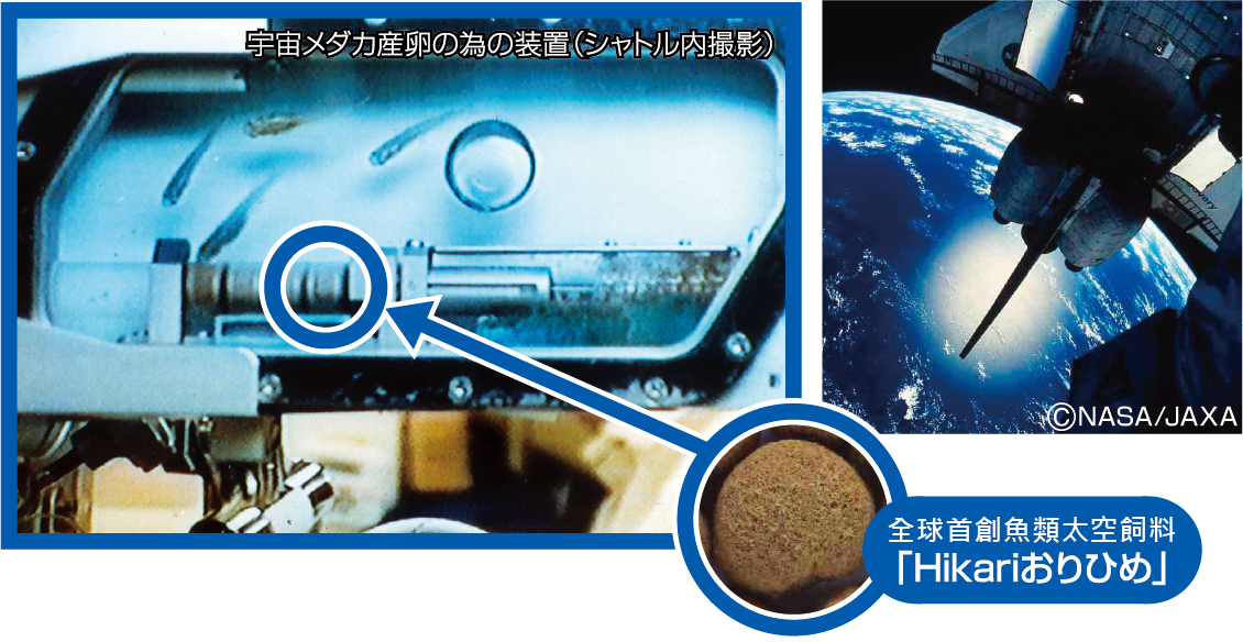 1994年7月日本首位女太空人一向井千秋女士搭乘哥倫比亞號執行太空任務,並於太空梭內進行鱂魚產卵實驗。該項實驗所使用的鱂魚太空飼料為本公司製造的『Hikari おりひめ』,在無重力的太空梭內水槽必須密閉,根本不可能打開進行換水等動作。