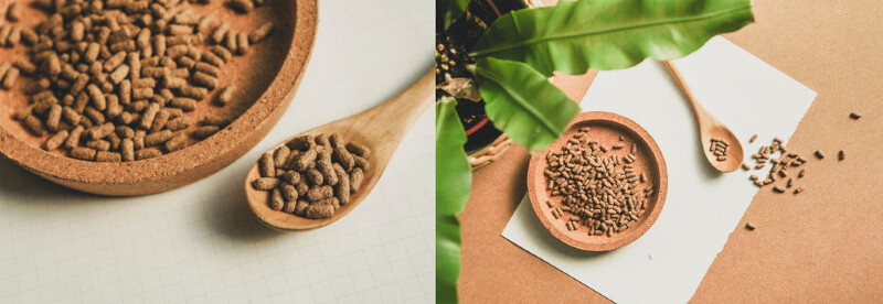 並考量到飼料中脂肪的含量比,添加脫脂麵包蟲及蠶蛹等天然食材。