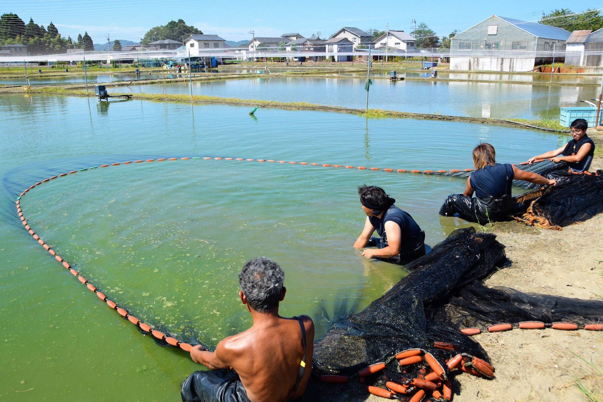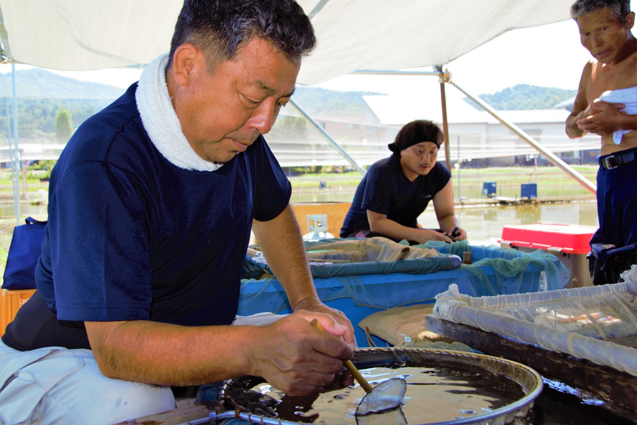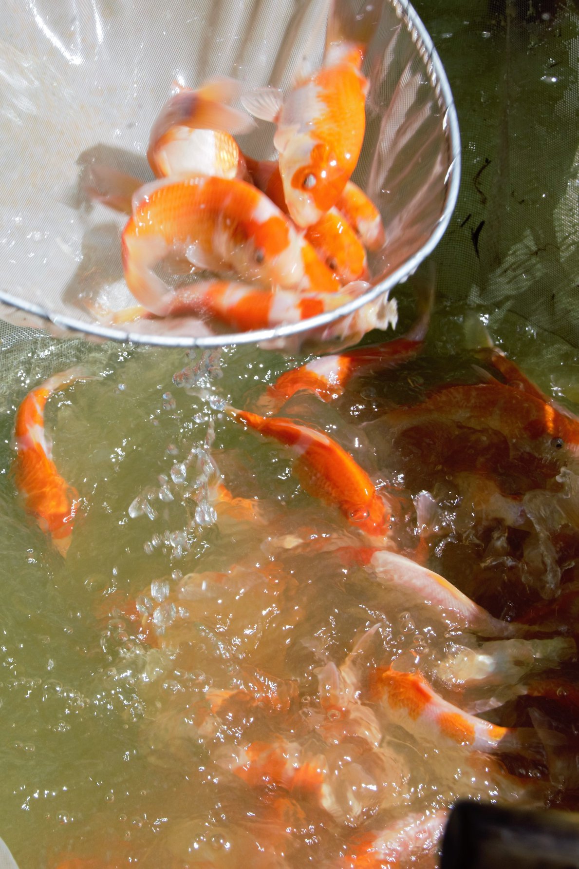 在炎熱的天氣中一次又一次重複作業,所有的努力皆是為了培育出優質的錦鯉。
