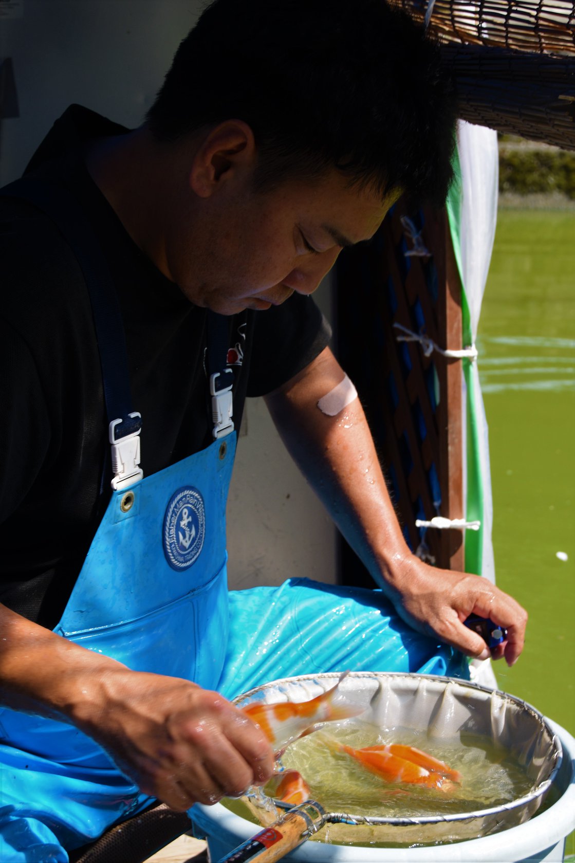 在酷熱的猛暑中,一次又一次的下網、選別錦鯉,重複著如此單調枯燥的工作。